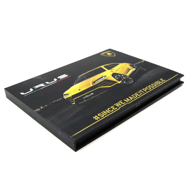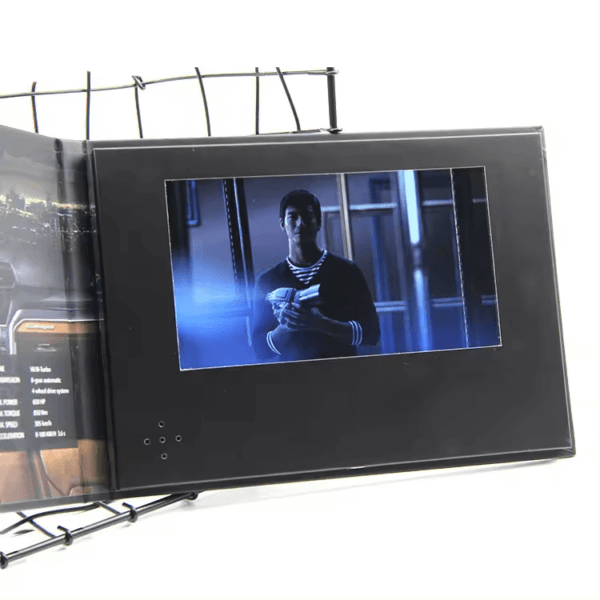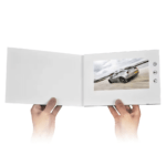 The standard Video Brochure has a magnetic switch, so it can autoplay videos once unfolded. It can be with multi-button with specific functions like power on/off switch, play/pause, play/FF, pause/REW, forward, backward, volume up, volume down, rewind, fast forward, video selection, etc. Buttons can be placed below the screen or on the screen left/right side. It takes a maximum of 10 buttons.